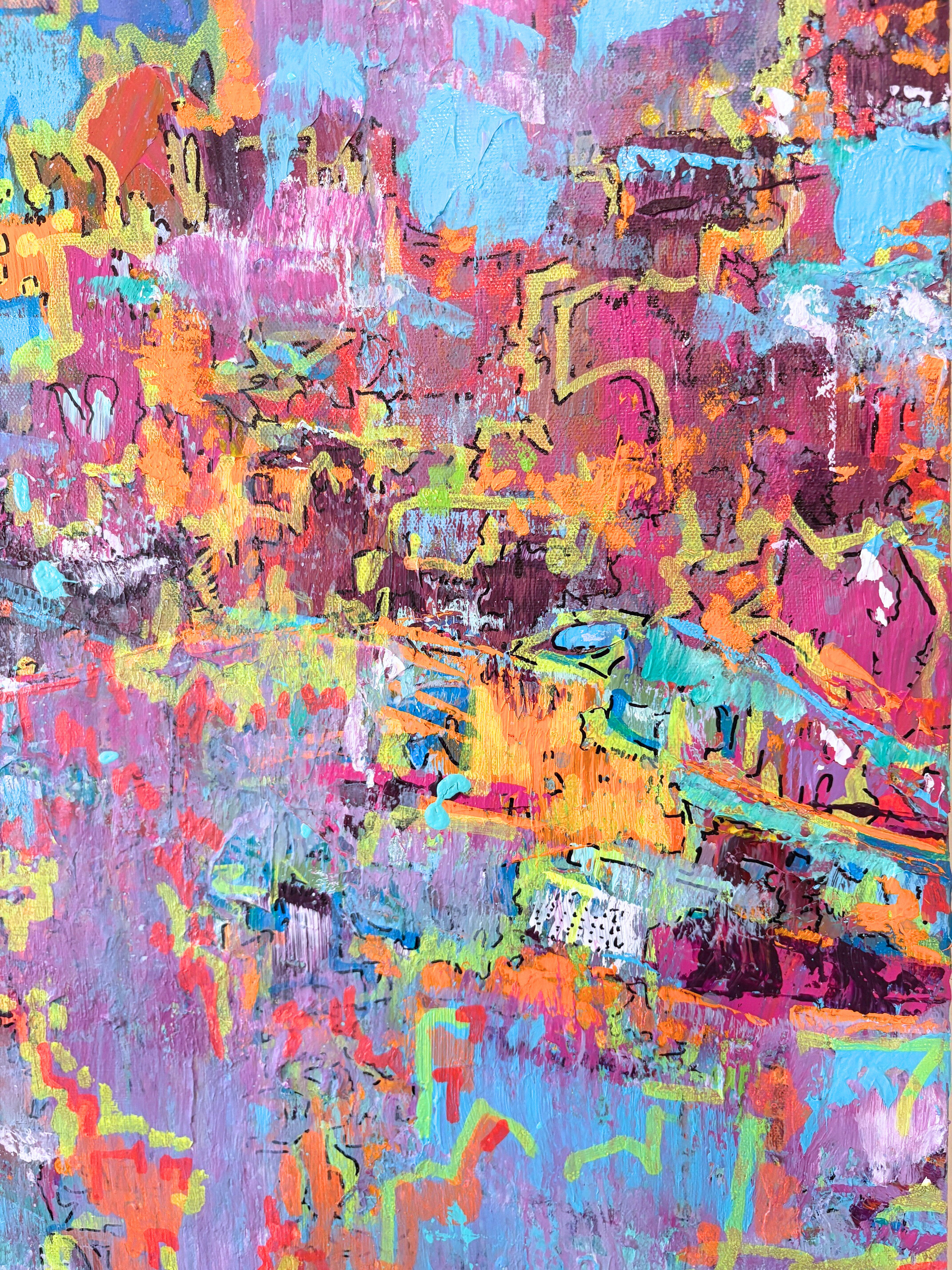"Electric Dreams" - This piece is heavily textured / I used heavy molding paste with the acrylic paint to retain palette knife marks and brushstrokes. Finished with Liquitex acrylic paint marker line work.