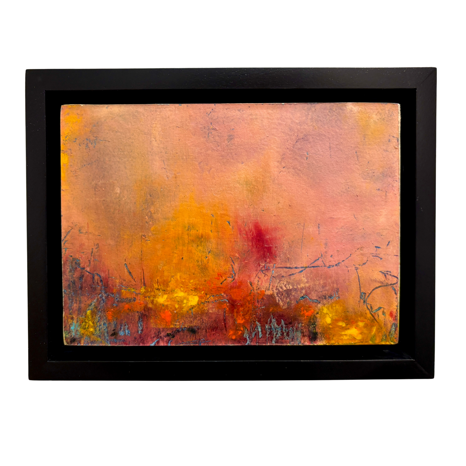 The piece is finished with a final coat of cold wax that is then buffed out to create an ever so slightly shiny surface. Colors pop with the black floater frame. Hanging hardware included.