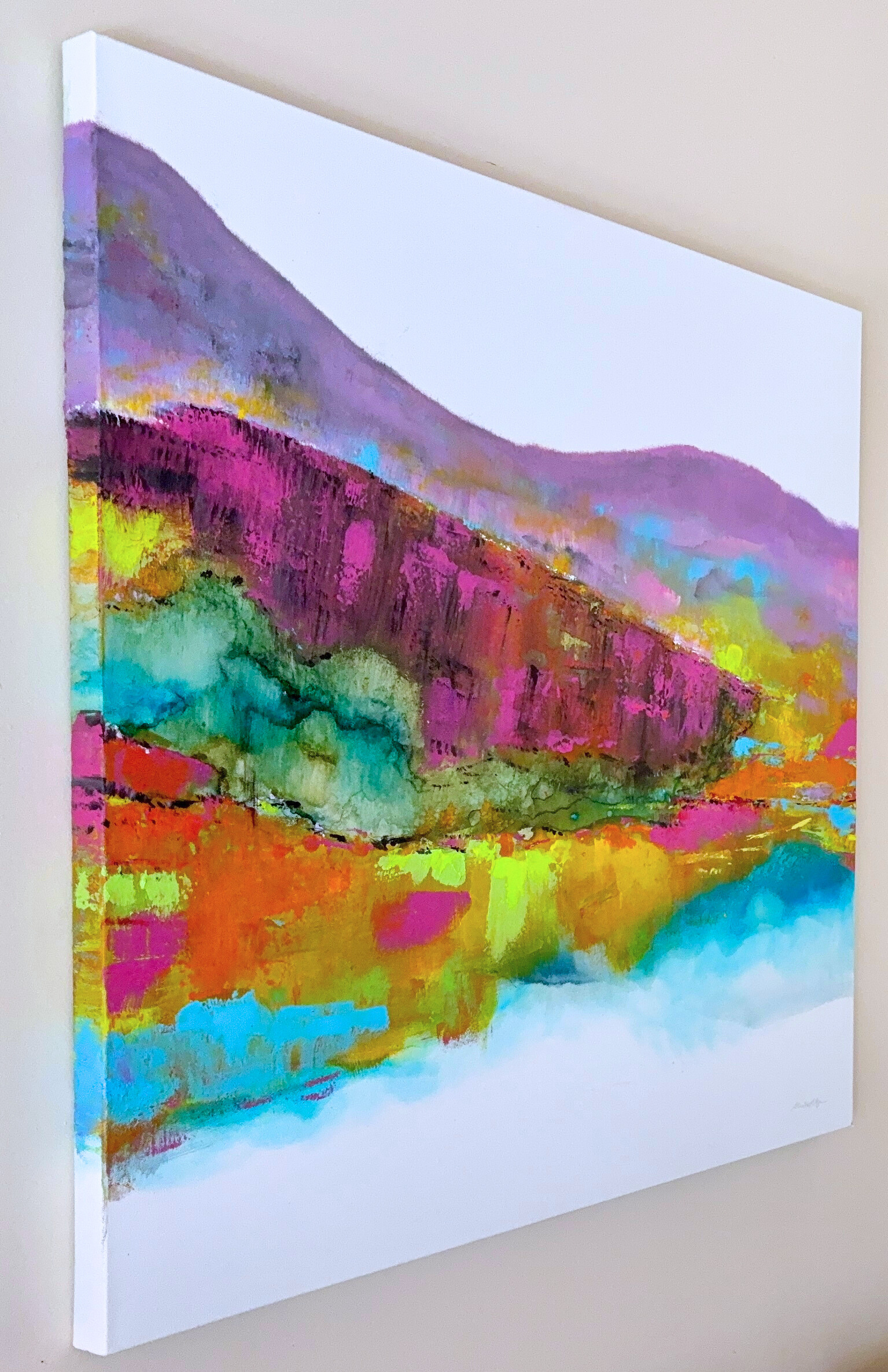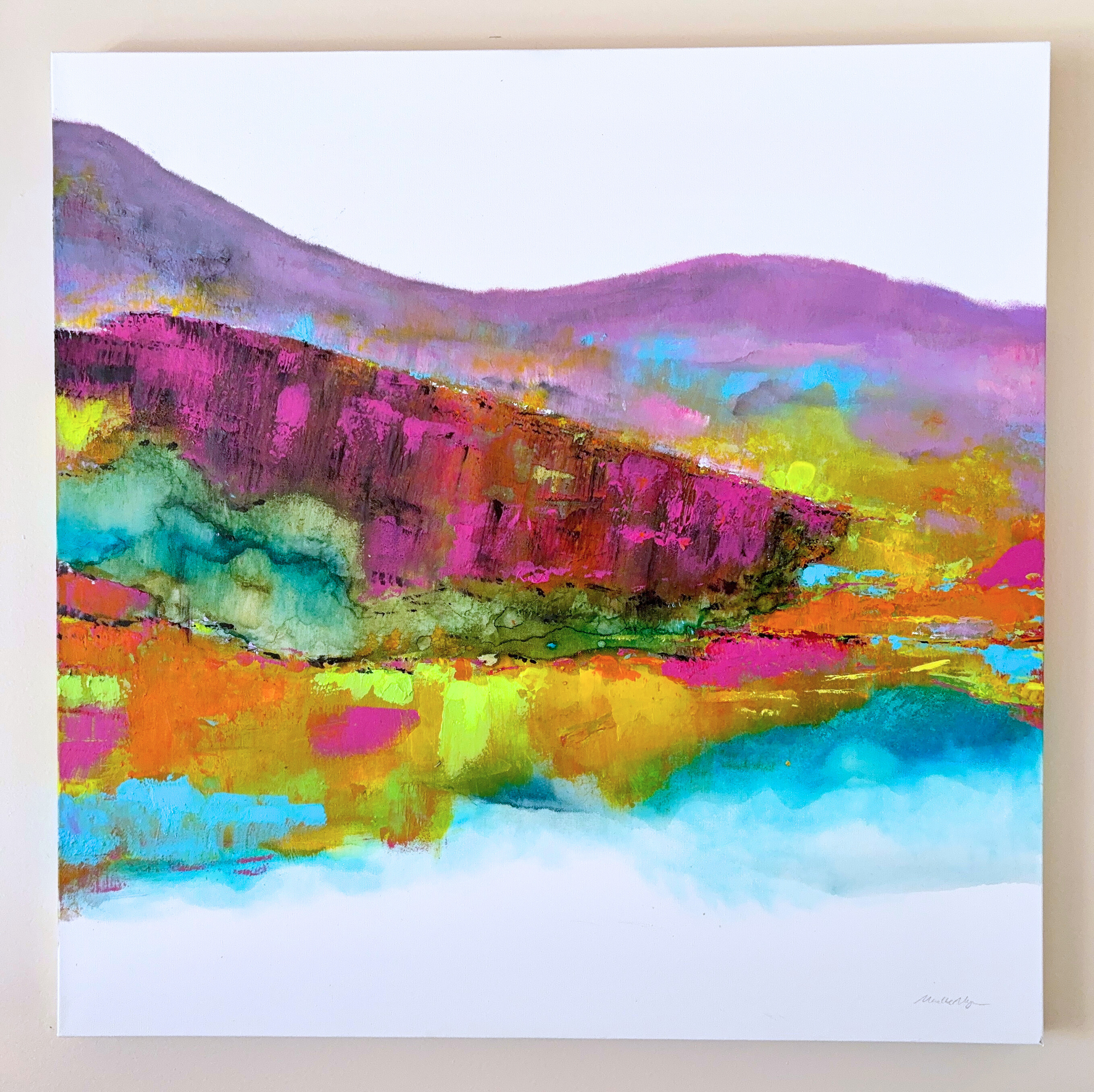 “River Bluff” - I grew up in middle Tennessee where there are many winding rivers with large towering limestone river bluffs. This painting is an ode to the landscapes of my former home with neon accents to represent the dynamic energy of flowing water around the river bend.